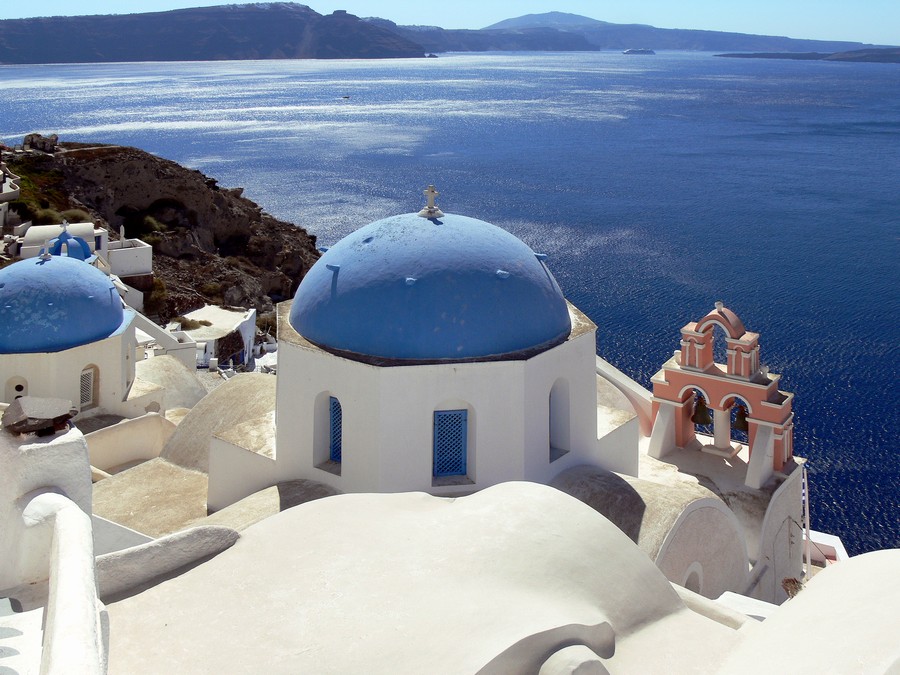 Oía ist wohl der spektakulärste Ort auf den Kykladen, an der Nordspitze Santorínis gelegen wurde er durch ein verheerendes Erdbeben 1956 total zerstört. Die Häuser und Kirchen hängen am Kraterrand, ein faszinierendes Labyrinth von Treppengässche, Kirchenkuppeln und dazwischen Höhlenwohnungen. So weltberühmt der Sonnenuntergang dort ist, herrscht jeden Abend ein Riesengedränge, denn jeder möchte den besten Ausblick haben.