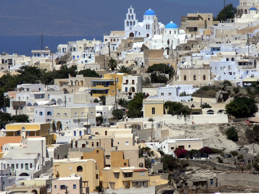 Pýrgos war die Hauptstadt zu Zeiten der Piratengefahr, nicht zuletzt wegen des grandiosen Ausblicks über die ganze Insel vom Kástro aus. Es wird auch als Penthouse der Insel bezeichnet, extrem verwinkelt, mit Treppen, Gassen und Kirchen. In Vlicháda an der südlichsten Spitze Santorínis waren wir meist baden, gewohnt haben wir im Hotel Zéphyros in Kamári.