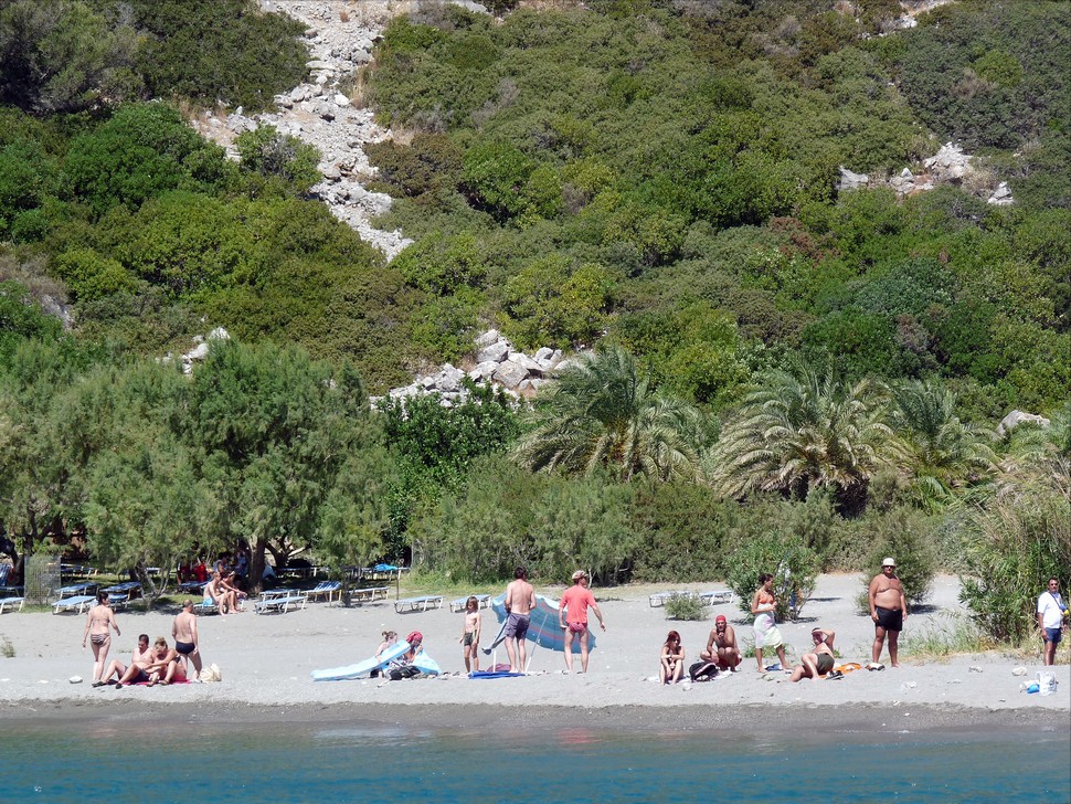 Mit dem Auto gehts zum Hafen nach Agia Galini, von dort mit dem Boot Argonautes an der Küste entlang zum Palmenstrand Preveli.Die letzte halbe Stunde wurde das Meer ganz schön unruhig und wir wurden naß gespritz tund mußten nach innen flüchten. Am Beach angekommen wandern wir entlang des Flusses durch Palmenwälder,über Stock und Stein, klettern über Felsen bis die hohen Berge beginnen.