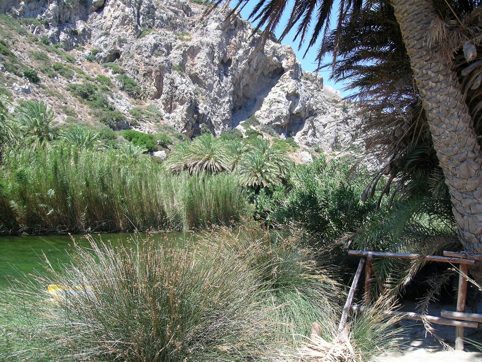Mit dem Auto gehts zum Hafen nach Agia Galini, von dort mit dem Boot Argonautes an der Küste entlang zum Palmenstrand Preveli.Die letzte halbe Stunde wurde das Meer ganz schön unruhig und wir wurden naß gespritz tund mußten nach innen flüchten. Am Beach angekommen wandern wir entlang des Flusses durch Palmenwälder,über Stock und Stein, klettern über Felsen bis die hohen Berge beginnen.