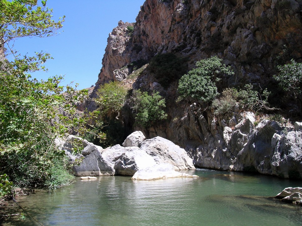 Mit dem Auto gehts zum Hafen nach Agia Galini, von dort mit dem Boot Argonautes an der Küste entlang zum Palmenstrand Preveli.Die letzte halbe Stunde wurde das Meer ganz schön unruhig und wir wurden naß gespritz tund mußten nach innen flüchten. Am Beach angekommen wandern wir entlang des Flusses durch Palmenwälder,über Stock und Stein, klettern über Felsen bis die hohen Berge beginnen.