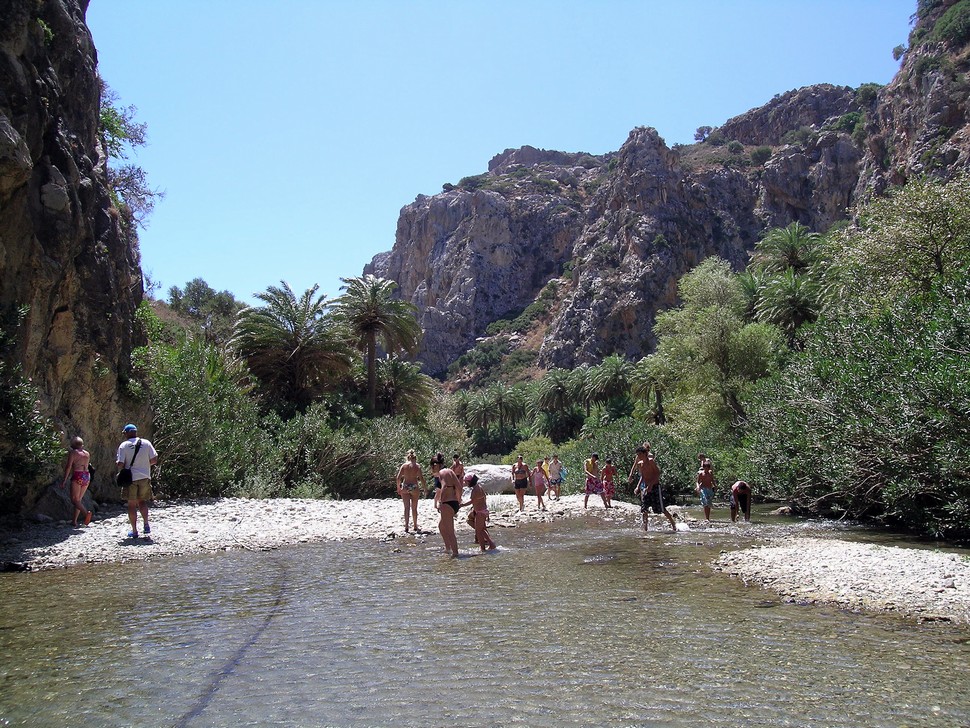 Mit dem Auto gehts zum Hafen nach Agia Galini, von dort mit dem Boot Argonautes an der Küste entlang zum Palmenstrand Preveli.Die letzte halbe Stunde wurde das Meer ganz schön unruhig und wir wurden naß gespritz tund mußten nach innen flüchten. Am Beach angekommen wandern wir entlang des Flusses durch Palmenwälder,über Stock und Stein, klettern über Felsen bis die hohen Berge beginnen.
