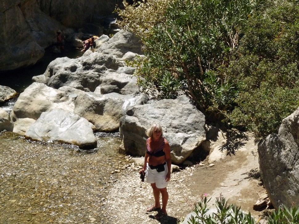 Mit dem Auto gehts zum Hafen nach Agia Galini, von dort mit dem Boot Argonautes an der Küste entlang zum Palmenstrand Preveli.Die letzte halbe Stunde wurde das Meer ganz schön unruhig und wir wurden naß gespritz tund mußten nach innen flüchten. Am Beach angekommen wandern wir entlang des Flusses durch Palmenwälder,über Stock und Stein, klettern über Felsen bis die hohen Berge beginnen.