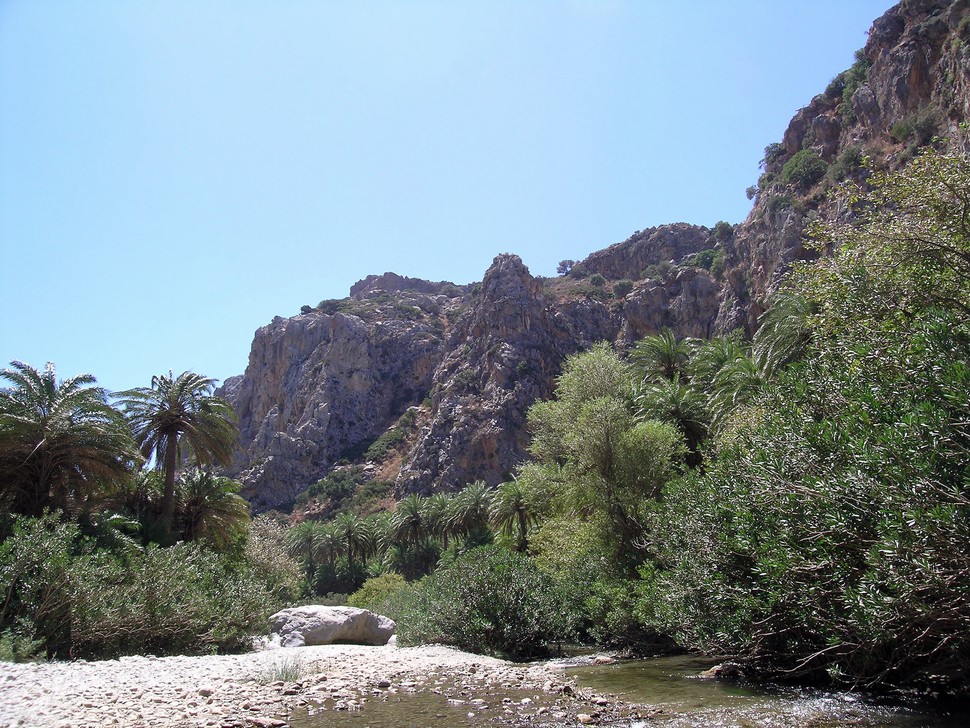 Mit dem Auto gehts zum Hafen nach Agia Galini, von dort mit dem Boot Argonautes an der Küste entlang zum Palmenstrand Preveli.Die letzte halbe Stunde wurde das Meer ganz schön unruhig und wir wurden naß gespritz tund mußten nach innen flüchten. Am Beach angekommen wandern wir entlang des Flusses durch Palmenwälder,über Stock und Stein, klettern über Felsen bis die hohen Berge beginnen.