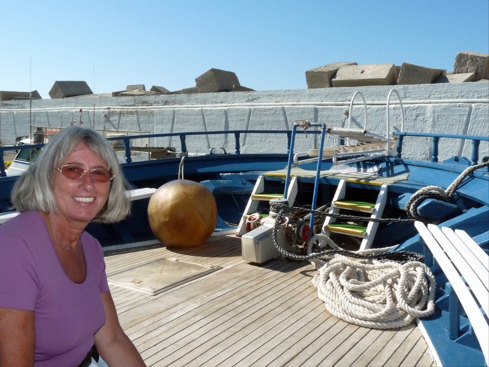 Mit dem Auto gehts zum Hafen nach Agia Galini, von dort mit dem Boot Argonautes an der Küste entlang zum Palmenstrand Preveli.Die letzte halbe Stunde wurde das Meer ganz schön unruhig und wir wurden naß gespritz tund mußten nach innen flüchten. Am Beach angekommen wandern wir entlang des Flusses durch Palmenwälder,über Stock und Stein, klettern über Felsen bis die hohen Berge beginnen.