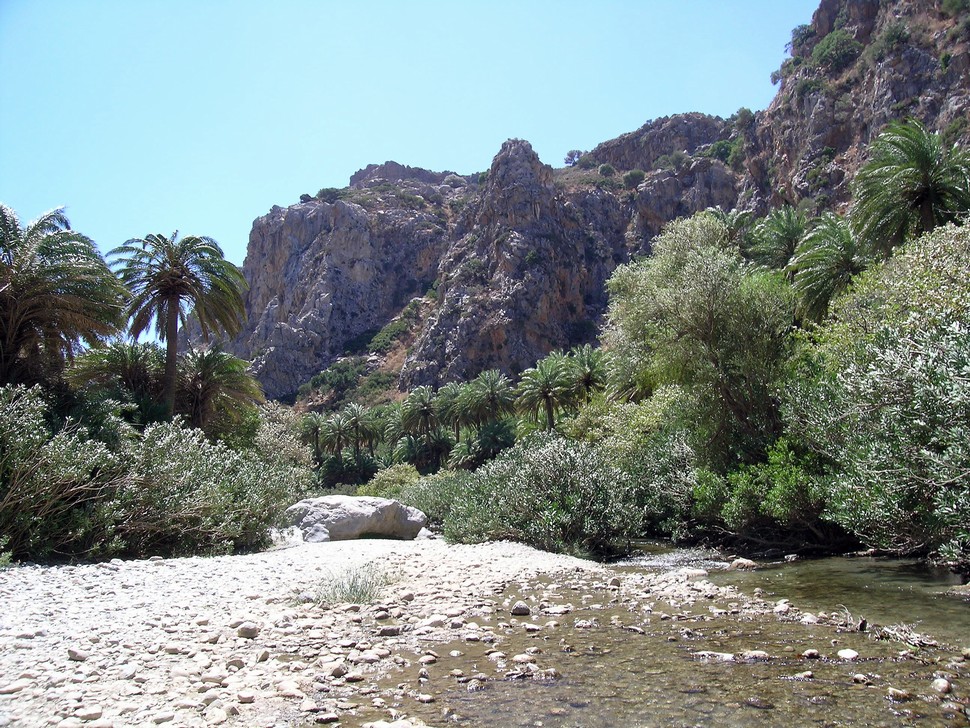 Mit dem Auto gehts zum Hafen nach Agia Galini, von dort mit dem Boot Argonautes an der Küste entlang zum Palmenstrand Preveli.Die letzte halbe Stunde wurde das Meer ganz schön unruhig und wir wurden naß gespritz tund mußten nach innen flüchten. Am Beach angekommen wandern wir entlang des Flusses durch Palmenwälder,über Stock und Stein, klettern über Felsen bis die hohen Berge beginnen.