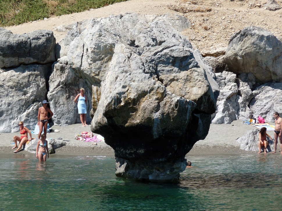 Mit dem Auto gehts zum Hafen nach Agia Galini, von dort mit dem Boot Argonautes an der Küste entlang zum Palmenstrand Preveli.Die letzte halbe Stunde wurde das Meer ganz schön unruhig und wir wurden naß gespritz tund mußten nach innen flüchten. Am Beach angekommen wandern wir entlang des Flusses durch Palmenwälder,über Stock und Stein, klettern über Felsen bis die hohen Berge beginnen.