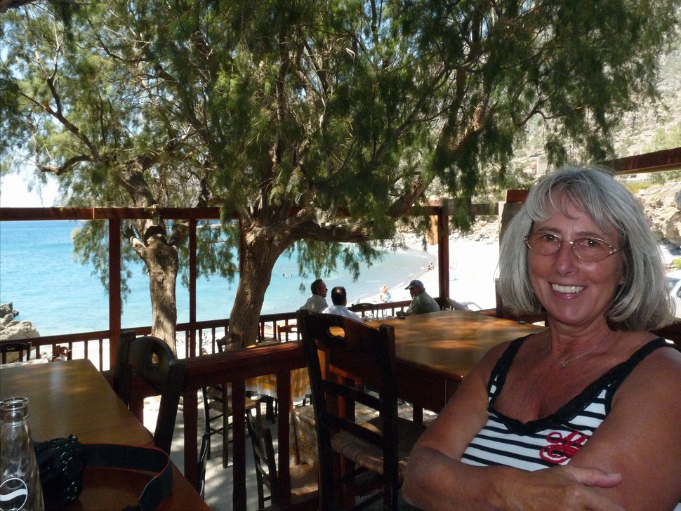 Diesmal klappt es und wir fahren die asphaltierte Straße hoch ins Gebirge auf über 1000m und finden Kapetaniana. Neo oder Kato war die Frage, in Kato schickte man uns nach Neo und von nun an gings bergab über ungesicherte Schotterwege. Waltraud war ganz ruhig geworden. Trotzdem eine tolle Fahrt entlang der Felsen. In Agios Ioanis finden wir schöne Buchten und eine urige Taverne.