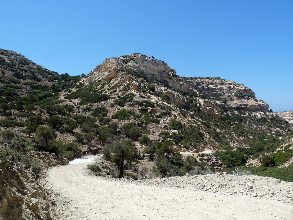 Heute fahren wir über Moni Odigitrias, wo wir den Mönchen eine CD mit unseren Bildern vom vergangenen Jahr übergeben und von denen wir wie jedes mal freundlich empfangen werden, auf Schotterstraßen vorbei an vielen Ziegen und Schafen Richtung Martsalo vorbei am Berg Kefali zur wunderschönen Bucht Vathi. Gewaltige Kreidefelsen säumen die Schotterstrasse.