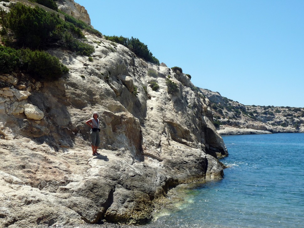 Heute fahren wir über Moni Odigitrias, wo wir den Mönchen eine CD mit unseren Bildern vom vergangenen Jahr übergeben und von denen wir wie jedes mal freundlich empfangen werden, auf Schotterstraßen vorbei an vielen Ziegen und Schafen Richtung Martsalo vorbei am Berg Kefali zur wunderschönen Bucht Vathi. Gewaltige Kreidefelsen säumen die Schotterstrasse.