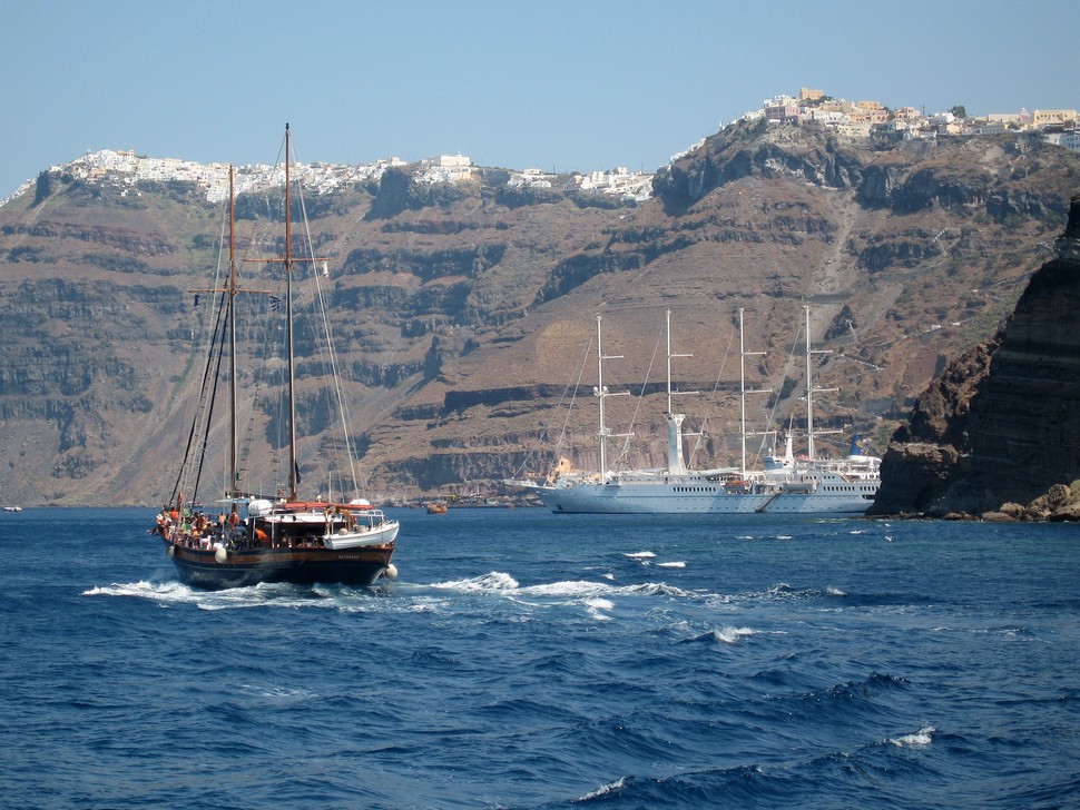 Sommerferien 2008 Griechische Inseln Kreta und Santorin Santorin - Caldera-Rundfahrt mit einem Piratenschiff