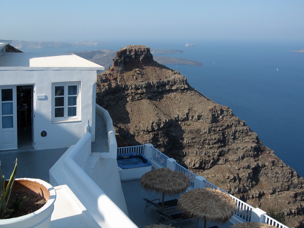 Unser Hotel Andromeda Villas hat eine grandiose Lage am Kraterrand und die Sonnenuntergänge auf der Terrasse sind super, aber bei den Appartements muß mann die teuren nehmen. Gebadet haben wir immer am Strand bei Vlichada, die Ausgrabungen bei Akrotiri sind geschlossen, aber auf dem Weg dahin gibt es schöne Aussichtspunkte und Tavernen.