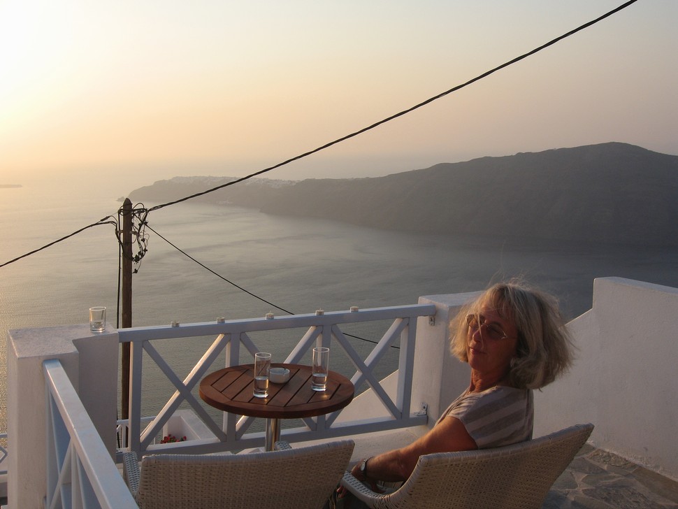 Unser Hotel Andromeda Villas hat eine grandiose Lage am Kraterrand und die Sonnenuntergänge auf der Terrasse sind super, aber bei den Appartements muß mann die teuren nehmen. Gebadet haben wir immer am Strand bei Vlichada, die Ausgrabungen bei Akrotiri sind geschlossen, aber auf dem Weg dahin gibt es schöne Aussichtspunkte und Tavernen.