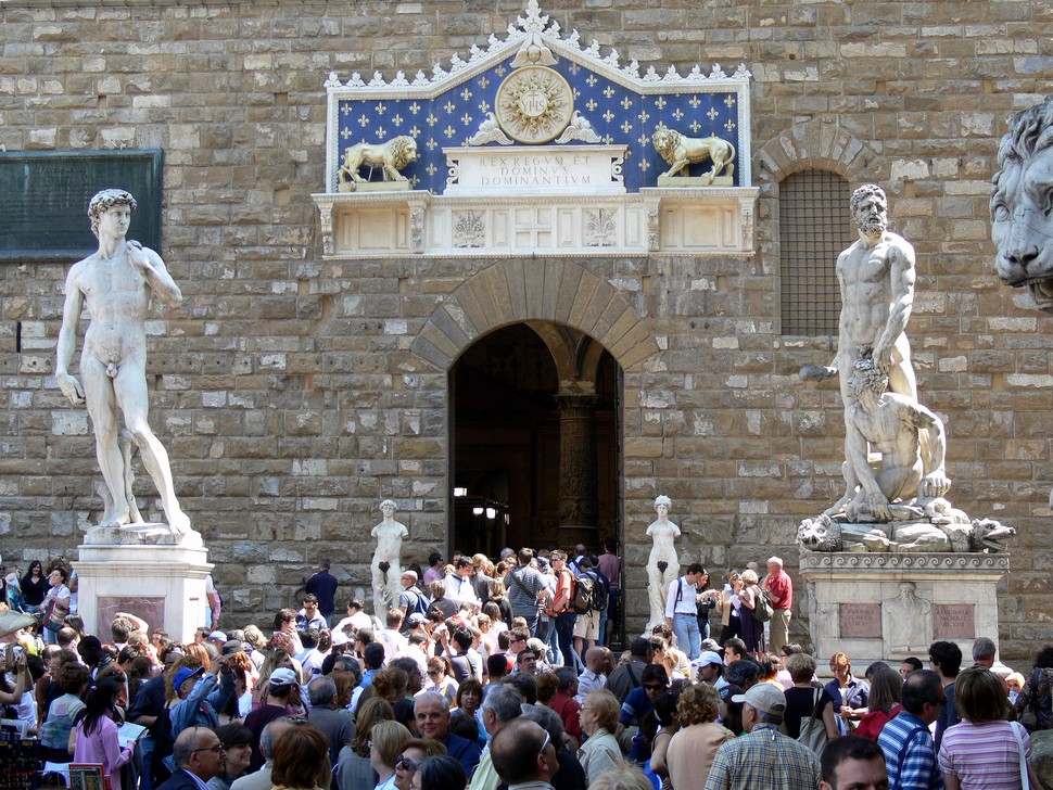 Wir lassen uns zum Piazzale Michelangelo führen, um denn herrlichen Ausblick auf die ganze Stadt zu genießen, ehe wir uns durch die Menschenmassen uber den Ponte Vecchio quälen. Wir kommen vorbei an den Uffizien, davor riesige Menschenschlangen, die Eintrittakarten kaufen wollen, weiter gehts zum Neptunbrunnen ehe wir dann an unserem Ziel, dem Dom, ankommen.