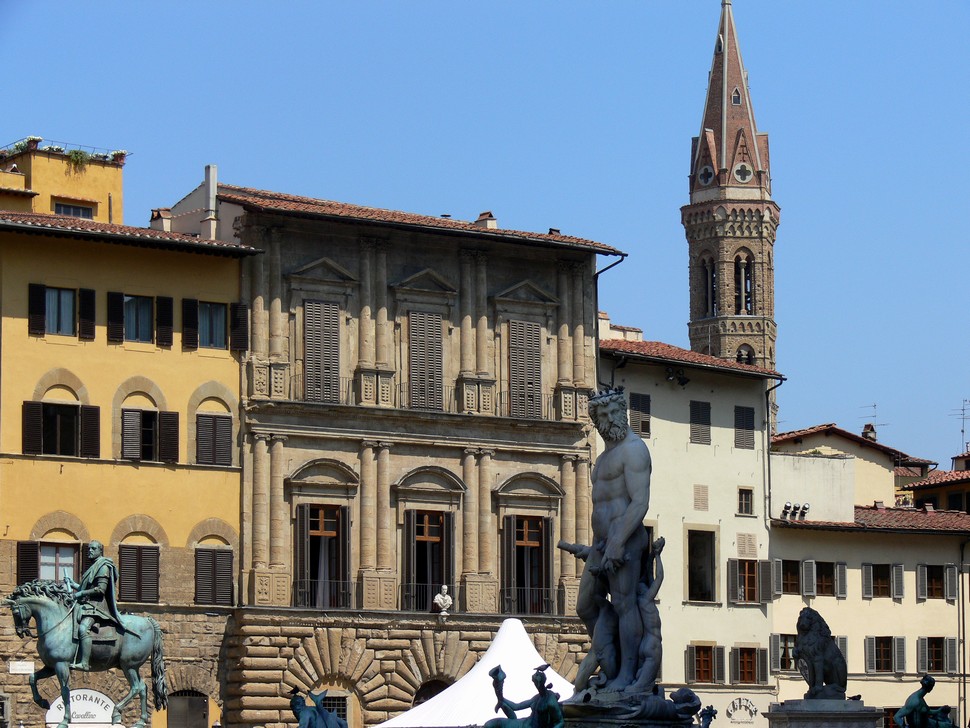 Wir lassen uns zum Piazzale Michelangelo führen, um denn herrlichen Ausblick auf die ganze Stadt zu genießen, ehe wir uns durch die Menschenmassen uber den Ponte Vecchio quälen. Wir kommen vorbei an den Uffizien, davor riesige Menschenschlangen, die Eintrittakarten kaufen wollen, weiter gehts zum Neptunbrunnen ehe wir dann an unserem Ziel, dem Dom, ankommen.