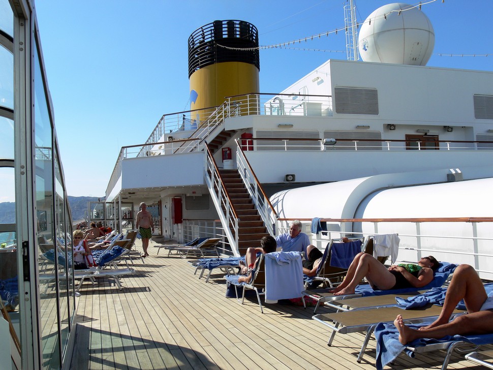 Unser Kreuzfahrtschiff diesmal die Costa Fortuna hat eine Länge von 273m und eine Breite von 36m. Sie besteht aus 17 Decks, davon sind 13 Gästedecks, und fährt maximal 24 Knoten. 3 große Bordrestaurants versorgen 3000 Passagiere. 11 Bars mit Livemusik, sowie Casino, Theater, Internetcafé und 1.300 qm Fitnessbereich lassen keine Langeweile aufkommen. Wir trafen in der Zigarren-und Cognac-Bar den Comandante Anelito Montesarchio und machten daraus gleich einen Fototermin.