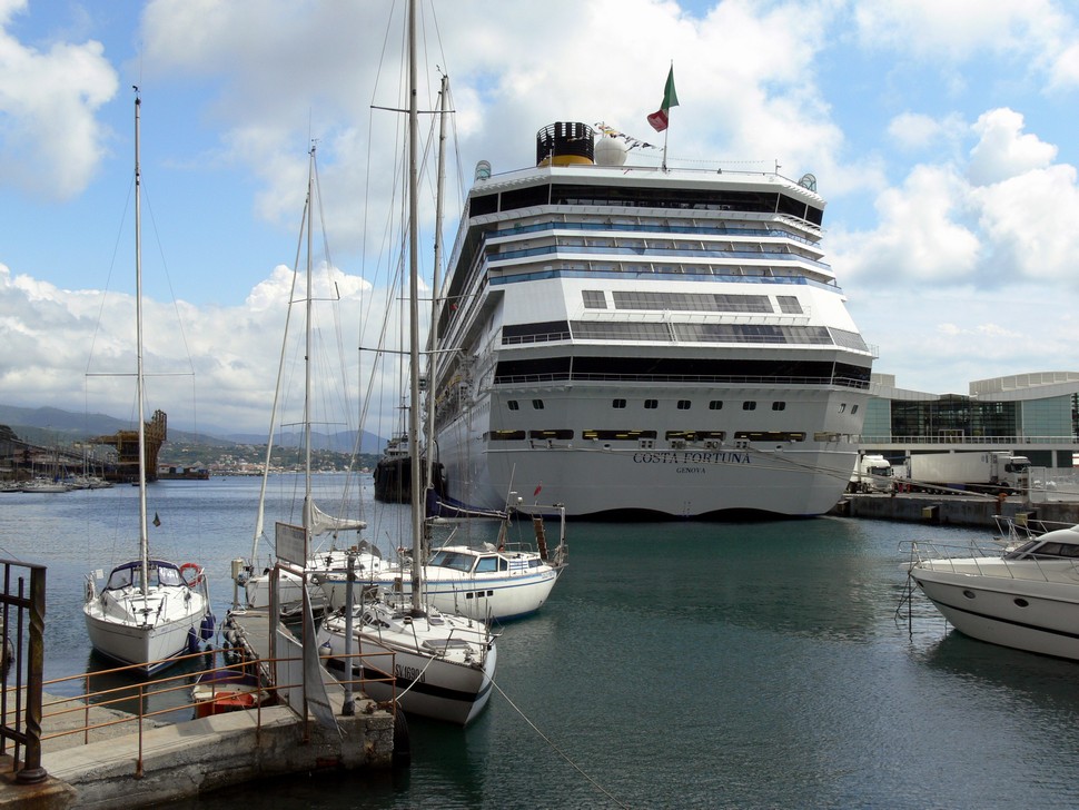 Unser Kreuzfahrtschiff diesmal die Costa Fortuna hat eine Länge von 273m und eine Breite von 36m. Sie besteht aus 17 Decks, davon sind 13 Gästedecks, und fährt maximal 24 Knoten. 3 große Bordrestaurants versorgen 3000 Passagiere. 11 Bars mit Livemusik, sowie Casino, Theater, Internetcafé und 1.300 qm Fitnessbereich lassen keine Langeweile aufkommen. Wir trafen in der Zigarren-und Cognac-Bar den Comandante Anelito Montesarchio und machten daraus gleich einen Fototermin. |