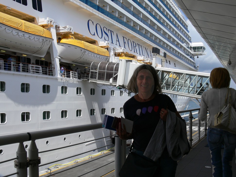 Unser Kreuzfahrtschiff diesmal die Costa Fortuna hat eine Länge von 273m und eine Breite von 36m. Sie besteht aus 17 Decks, davon sind 13 Gästedecks, und fährt maximal 24 Knoten. 3 große Bordrestaurants versorgen 3000 Passagiere. 11 Bars mit Livemusik, sowie Casino, Theater, Internetcafé und 1.300 qm Fitnessbereich lassen keine Langeweile aufkommen. Wir trafen in der Zigarren-und Cognac-Bar den Comandante Anelito Montesarchio und machten daraus gleich einen Fototermin.